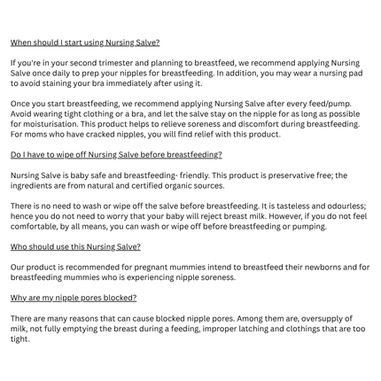 The Buds Organic Nursing Salve is a gentle, certified organic balm specially created to soothe, protect, and repair sore or cracked nipples caused by breastfeeding. Made with safe, edible-grade ingredients, it requires no washing before nursing, giving comfort and convenience to breastfeeding mothers.