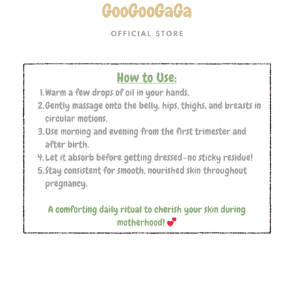 *Apply this oil to abdomen, hips, thighs and breasts, morning and evening. Do not apply to breasts when breastfeeding and to recent cesarean scars.*